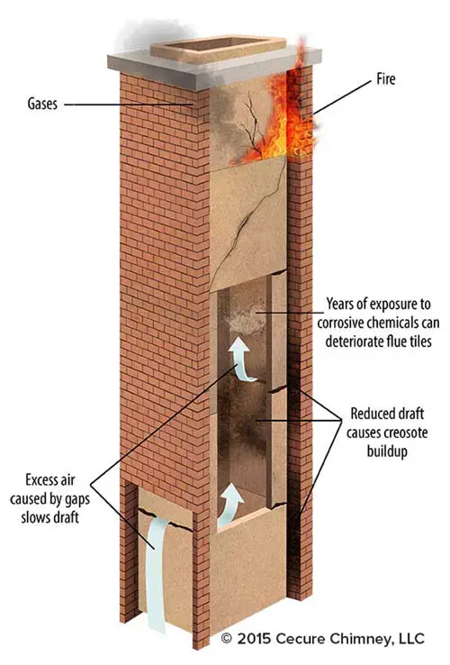 Gaps in flue tile joints and cracked flue tiles also allow outside air into the flue. This slows the chimney’s draft and cools the smoke which causes accelerated creosote accumulation and a weak draft which can cause smoking into the home. Creosote buildup in the flue is the #1 cause of chimney fires.