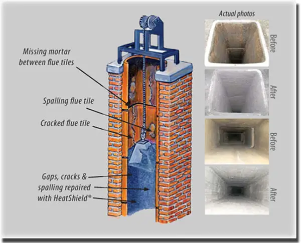 - HeatShield is non-destructive. Sometimes relining requires the removal of some if not all flue tiles. Breaking out flue tiles is a huge mess and can cause unintentional damage to a home. HeatShield does not require tile removal.
